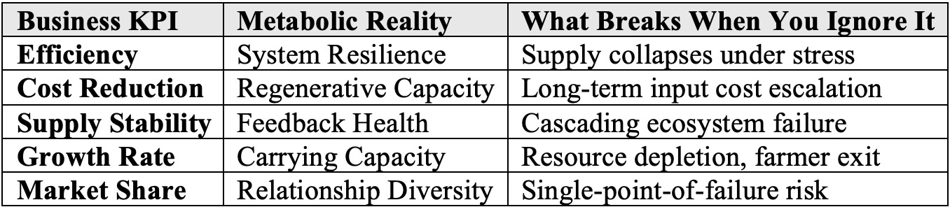 These aren’t externalities. They’re metabolic indicators that determine whether your business can scale sustainably or whether it’s scaling toward collapse.
